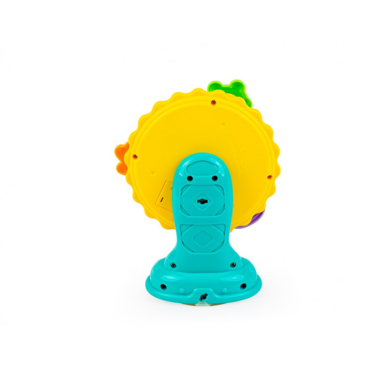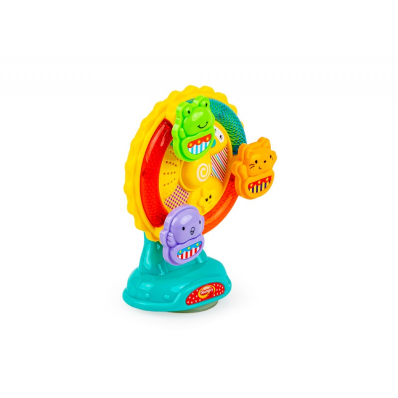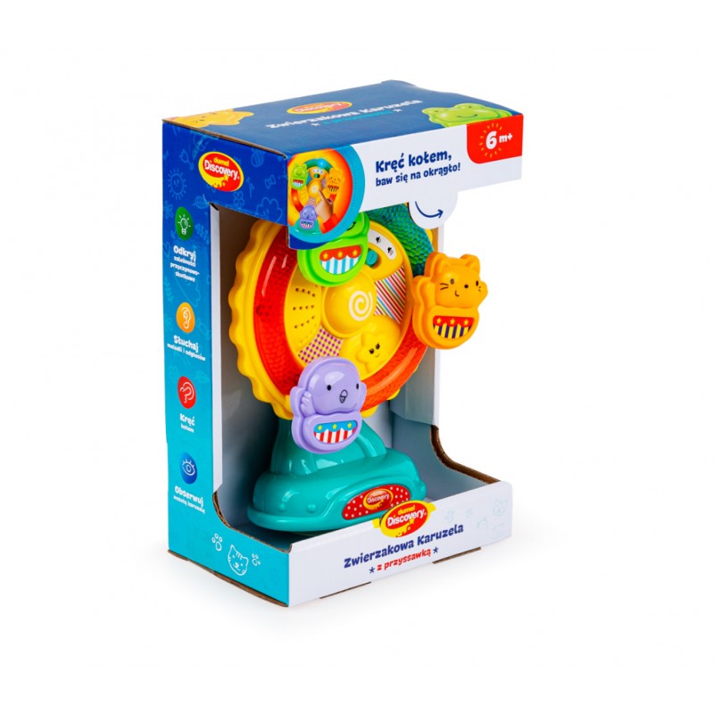 Zakręć kołem karuzeli i włącz się do zabawy! Karuzelka kryje w sobie odgłosy zwierząt, melodie i migające światełka, a dzięki praktycznej przyssawce, można ją przymocować do płaskiej, czystej i gładkiej powierzchni, aby nie przesuwała się w trakcie zabawy.