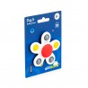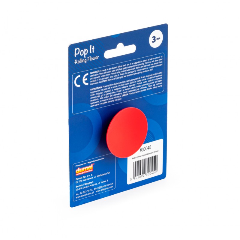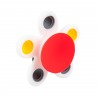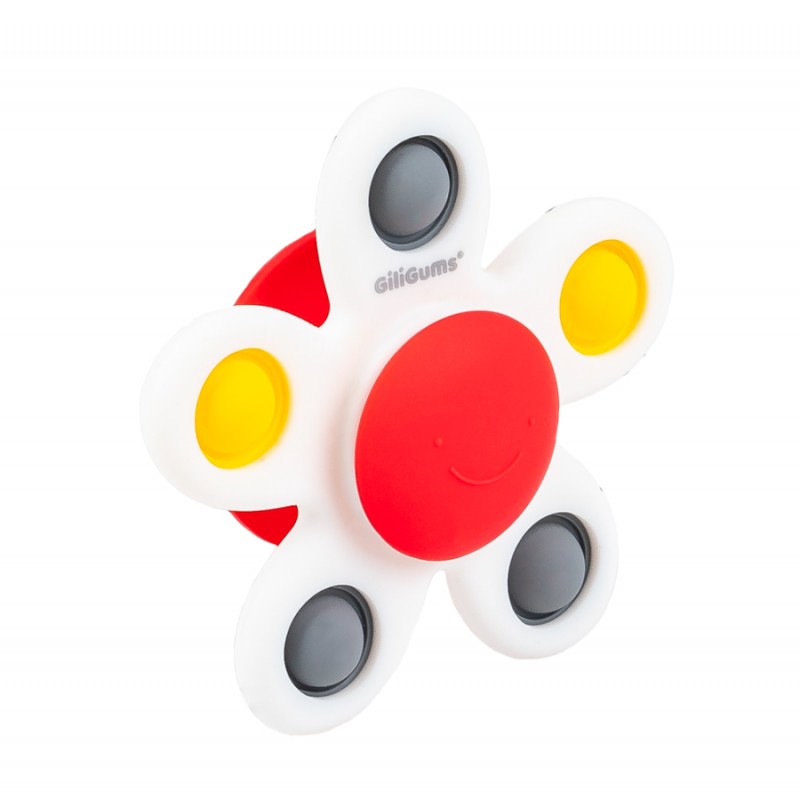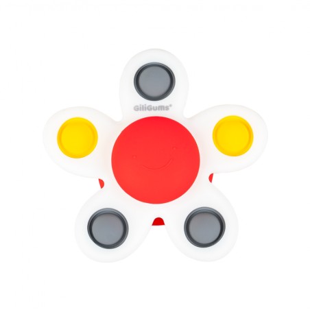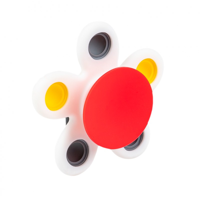 Zabawka wyposażona została w praktyczną przyssawkę, dzięki czemu można ją przymocować do czystej i gładkiej powierzchni, aby nie przesuwała się podczas zabawy. Tak przyczepionym kwiatkiem można kręcić, obserwując przy tym jak wesoło wiruje. Kontrastowe kolory zabawki stymulują wzrok maluszka, a kuleczki do wciskania, umieszczone na płatkach, dotyk. Wciskając kulki do środka i z powrotem, na zewnątrz kwiatka, dziecko może rozwijać zdolności poznawcze, a także ćwiczyć paluszki.