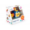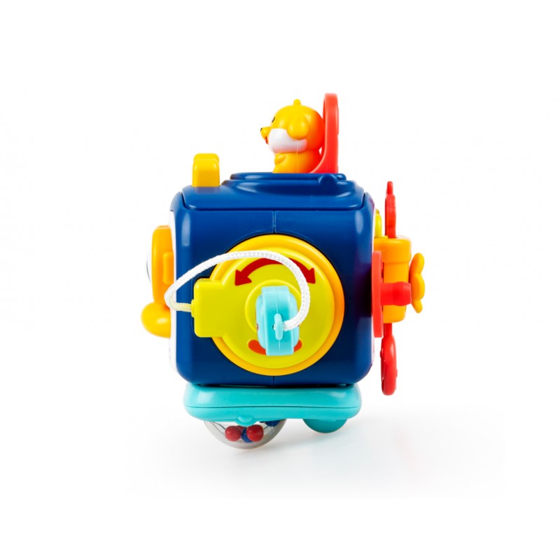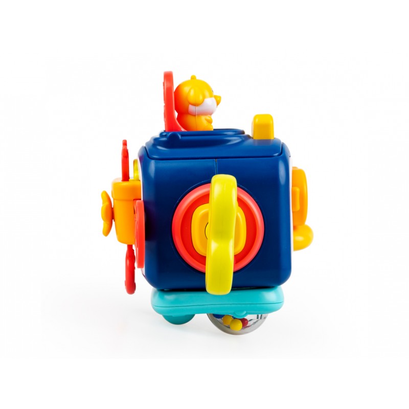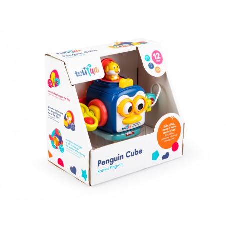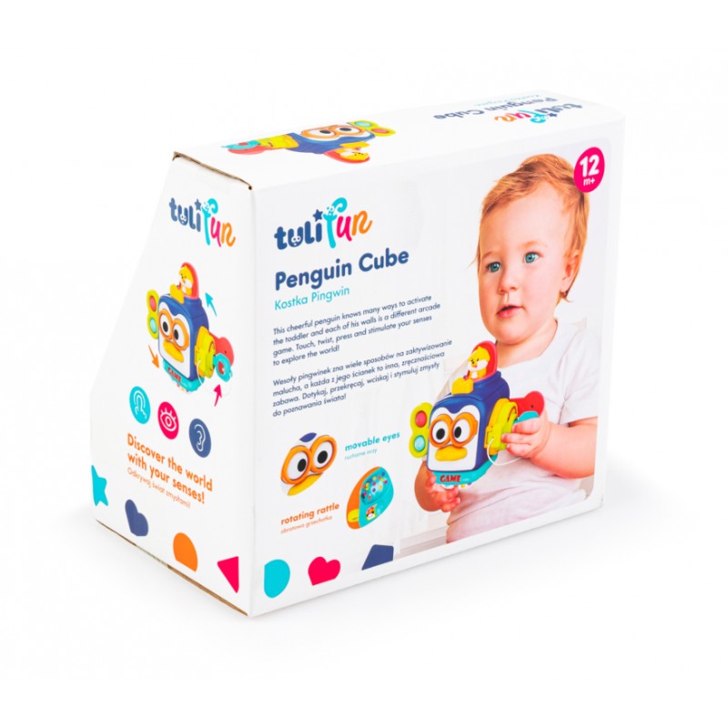 Ta sprytna kostka posiada wiele aktywności, które pomogą najmłodszym ćwiczyć sprawność paluszków i rozwijać zdolności poznawcze. Zabawka posiada obrotową grzechotkę, kuleczki pop it do wciskania, klapkę otwieraną za pomocą kluczyka i inną, z której wyskakuje piesek. Ścianka z pingwinkiem także wyposażona została w aktywny przycisk – dzióbek, którego naciśnięcie powoduje poruszanie się oczu zwierzaka.