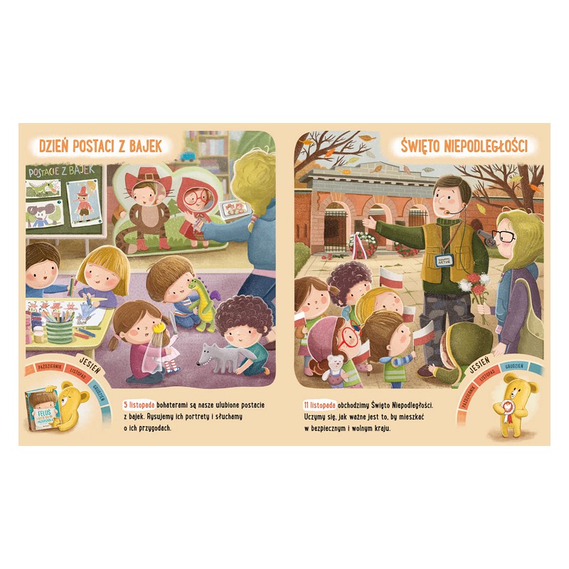 Dziecko uczy się tego wszystkiego dzięki obserwacji zmian zachodzących w przyrodzie oraz przeżywaniu wyjątkowych okazji i świąt. Dlatego w najnowszym tomie Feluś i Gucio uczestniczą w rozmaitych uroczystościach. Są tu opisy świąt ludowych, religijnych, państwowych, przedszkolnych i zupełnie prywatnych, a koło czasu pokazuje nazwę miesiąca, na który przypada dane wydarzenie.