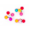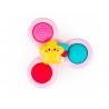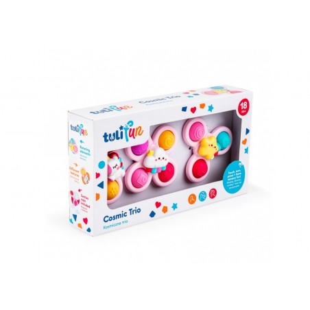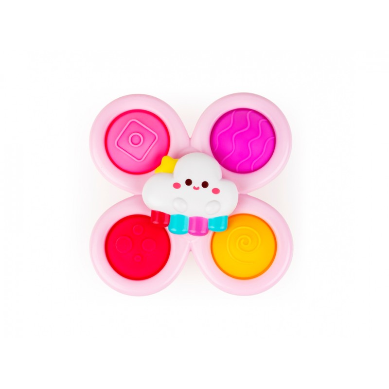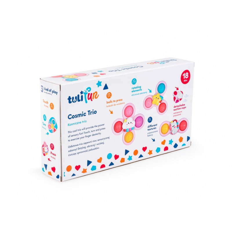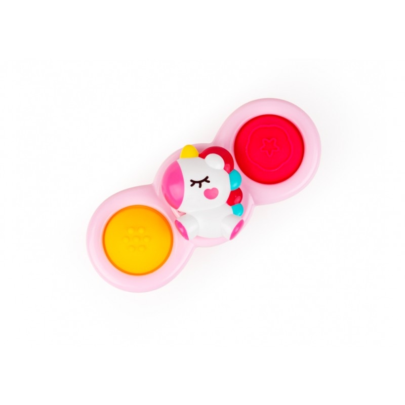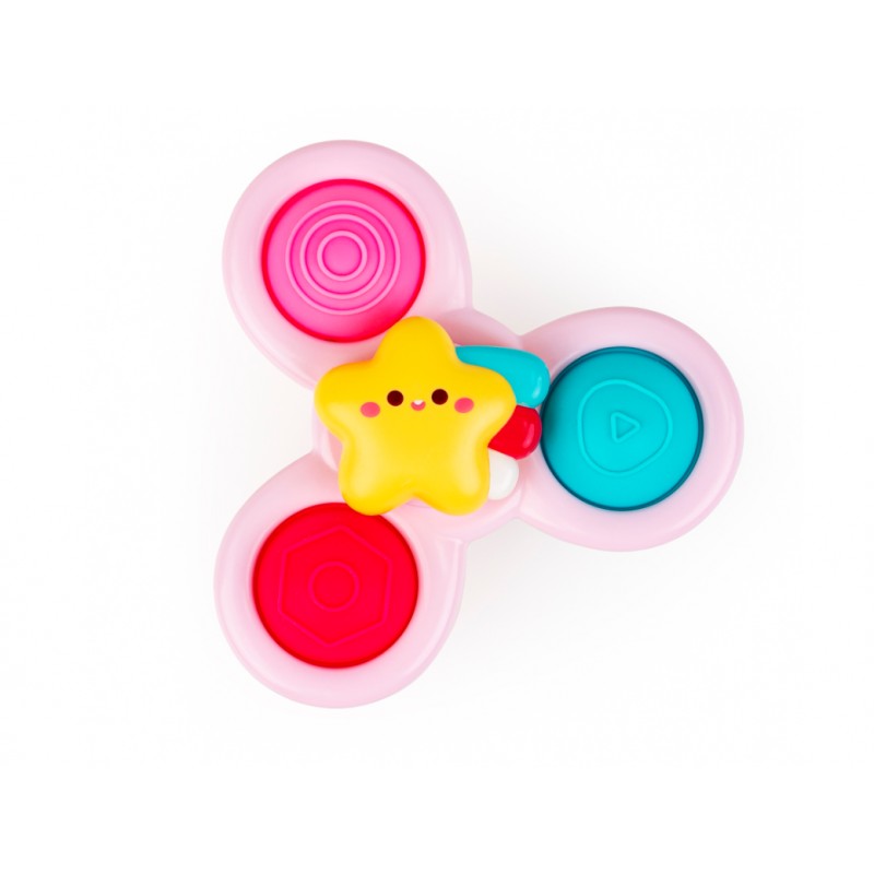 Każda z zabaweczek posiada kolejno dwa, trzy lub cztery kolorowe pola do wciskania, z wytłoczonymi kształtami. Zabawa polega na przepchnięciu kuleczek na drugą stronę zabawki, a następnie wypchnięciu ich z powrotem do góry. W zestawie znajdują się praktyczne przyssawki, dzięki którym bez trudu przymocujesz zabawkę do dowolnej czystej i gładkiej powierzchni. Po przymocowaniu, można kręcić nią za pomocą paluszka.