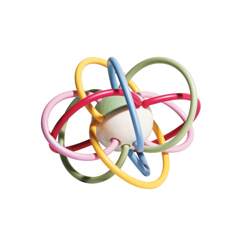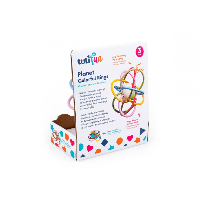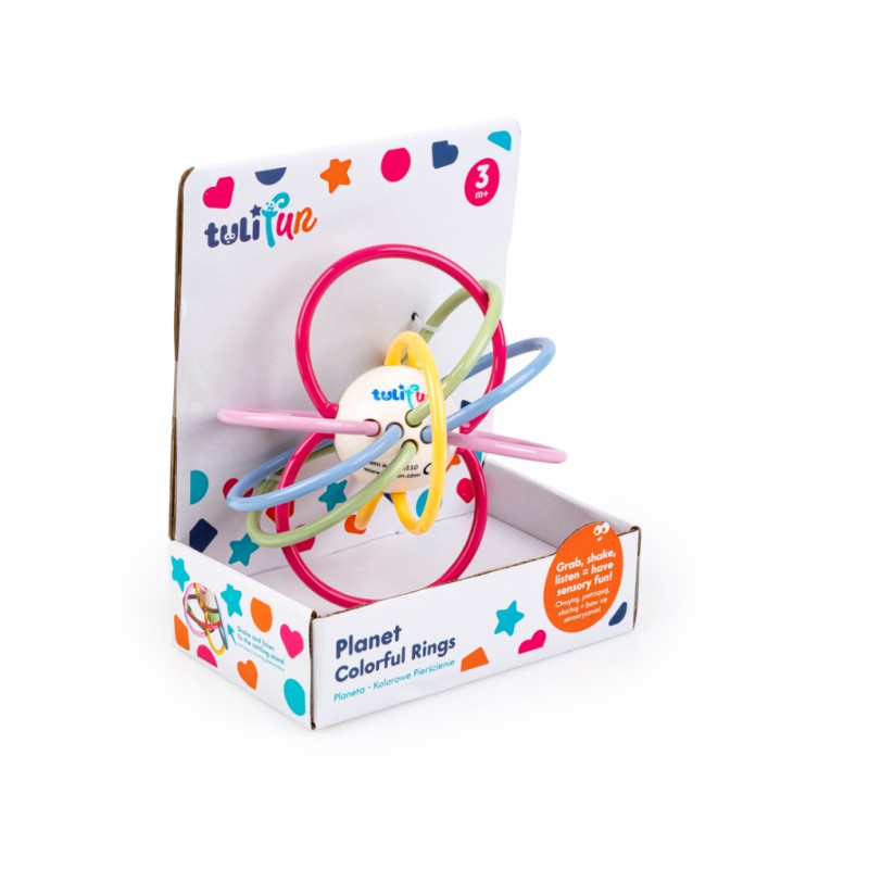 Piłeczka ozdobiona pierścieniami zachęca do nauki chwytania! Miękkie linki, które okalają zabawkę, ułatwiają dziecku trzymanie jej w rączkach.
