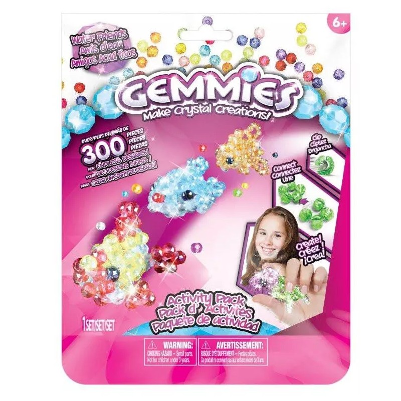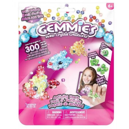 Barwna seria koralików Gemmies, to kreatywne zestawy, dzięki którym stworzysz czarujące figurki 3D, np. pieski, robaczki, kwiatki, rybki, owoce, smakołyki... Wystarczy, zgodnie ze wskazówkami, wsunąć koraliki na gumowe obręcze, które po połączeniu nadadzą figurce odpowiedni kształt. Zestaw tematyczny zawiera ponad 300 elementów umożliwiających stworzenie 3 figurek 3D. W zestawie znajdują się dwa opakowania Gemmies. Kolekcjonuj i wymieniaj się swoimi lśniącymi, kryształowymi kreacjami!