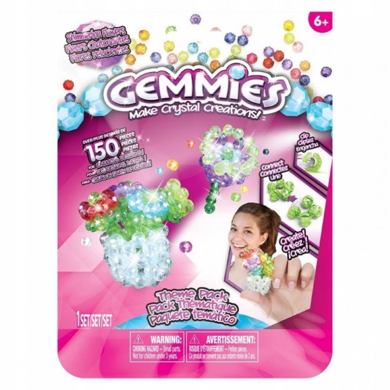Wystarczy, zgodnie ze wskazówkami, wsunąć koraliki na gumowe obręcze, które po połączeniu nadadzą figurce odpowiedni kształt. Zestaw tematyczny zawiera ponad 300 elementów umożliwiających stworzenie 3 figurek 3D. W zestawie znajdują się dwa opakowania Gemmies. Kolekcjonuj i wymieniaj się swoimi lśniącymi, kryształowymi kreacjami!