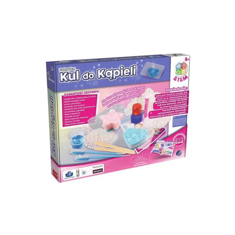Czy faktycznie kule muszą mieć kształt kul? Poznaj historię kąpieli, jak wyglądała w czasach starożytnych, kiedy traktowano ją jako wydarzenie towarzyskie, a kiedy była zakazana. Odkryj z czego składają się kule, jakie mają właściwości, kolory i zapachy. Poznaj naukowe oblicze kul, jakie reakcje chemiczne w nich zachodzą, i co sprawia, że kule buzują w wodzie – poznaj zjawisko eferwescencji. Dowiedz się jakie składniki należy dodać do kul, aby zmienić ich kolor, zapach i właściwości. Zaobserwuj jaki wpływ na twoją skórę ma stosowanie kąpieli z kulami. Podejmij naukowe wyzwanie i zaobserwuj jaki wpływ ma temperatura wody na rozpuszczanie się kul. Do wykonania: 6 eksperymentów.