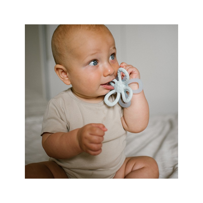 Ergonomiczny kształt został dopasowany do małych rączek dziecka. Wypustki na powierzchni gryzaka delikatnie masują dziąsła, pomagając dziecku odkrywać różnorodne faktury miękkiego silikonowego materiału.