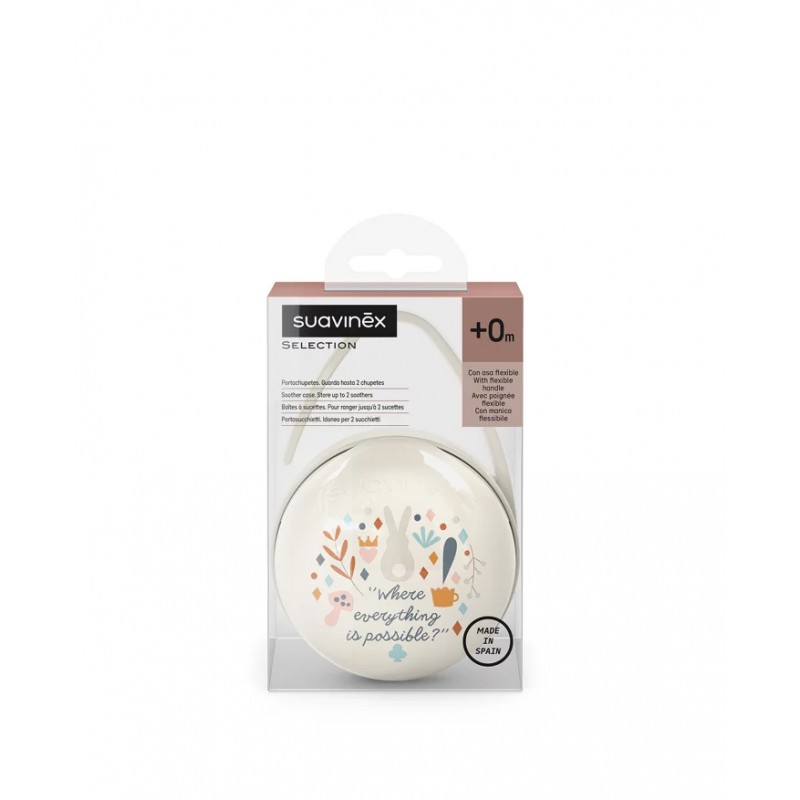 Składa się z dwóch oddzielnych części, które można rozdzielić, by przechowywać dwa smoczki w oddzielnych etui. Dzięki elastycznemu uchwytowi, etui można łatwo zawiesić na wózku, torbie lub łóżeczku, co sprawia, że smoczek jest zawsze pod ręką, gotowy do użycia, kiedy tylko jest potrzebny. Jest idealnym rozwiązaniem na spacerach i w podróży.
