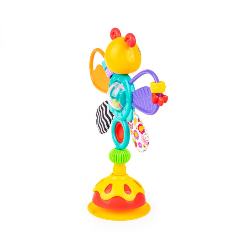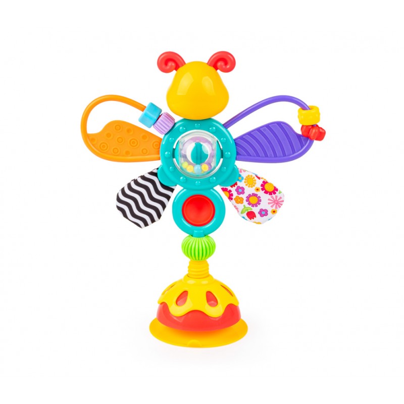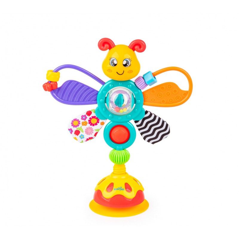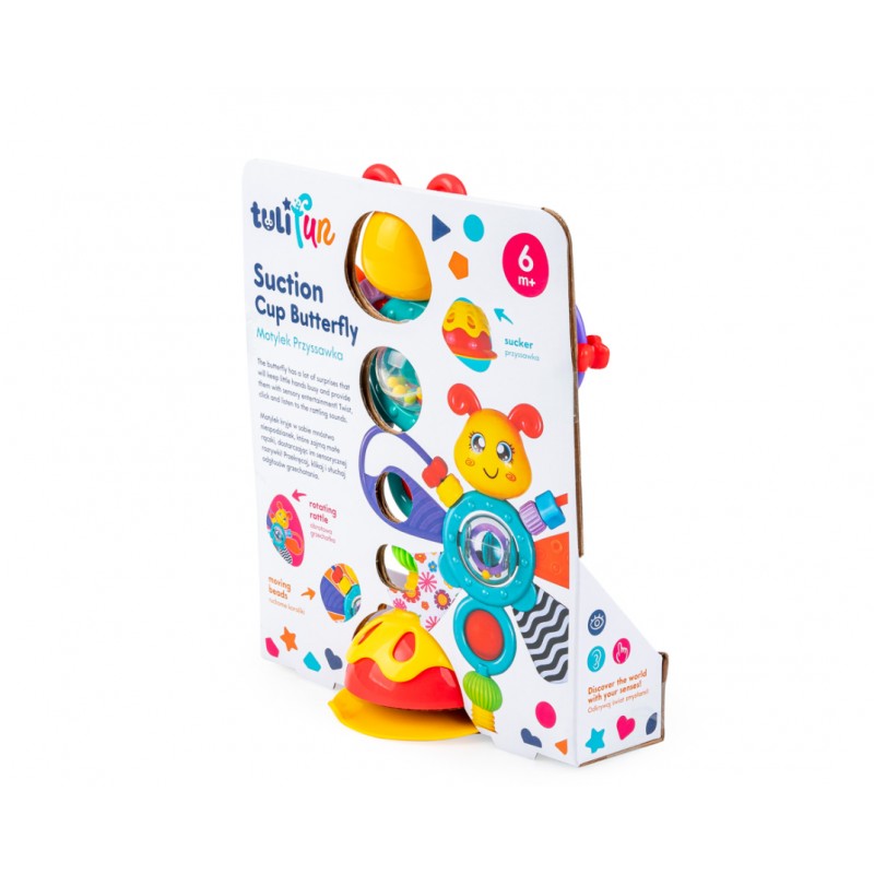 Na najmłodszych czekają szeleszczące skrzydełka, koraliki do przesuwania, obrotowa grzechotka, wzorzyste materiały i zróżnicowane faktury, które stymulować będą malucha do odkrywania świata wszystkimi zmysłami. Motylek posiada praktyczną przyssawkę, z której możesz korzystać na dwa sposoby. Kiedy przyssawka jest sucha, przymocujesz za jej pomocą motylka na krótką chwilę, aby dziecko mogło po pierwszej, statycznej zabawie, wziąć go w rączki i z bliska eksplorować wszystkie kolorowe skarby, które w sobie kryje. Po zwilżeniu przyssawki, bez trudu przymocujesz motylka na dłuższy czas do czystej, gładkiej powierzchni, ułatwiając tym samym maluchowi zabawę, gdy siedzi przy stoliku.