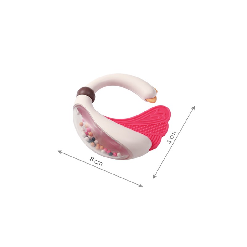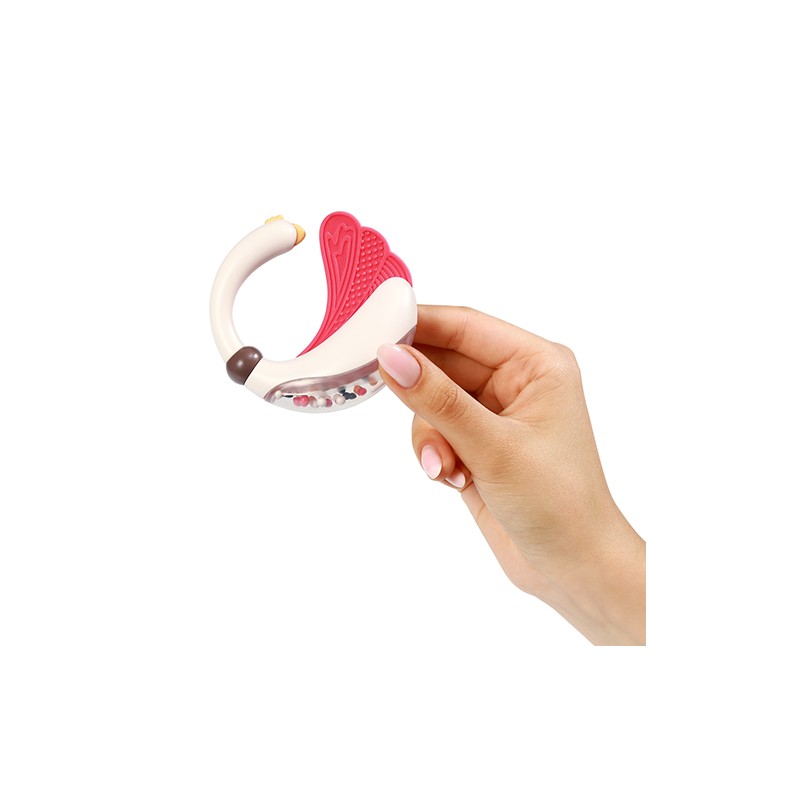 Poręczna konstrukcja grzechotki umożliwia jej wygodne trzymanie w małych rączkach dziecka. Poruszanie grzechotką wspiera rozwój zdolności motorycznych u niemowląt, pomagając w stymulowaniu koordynacji ręka-oko oraz manipulacji przedmiotami.