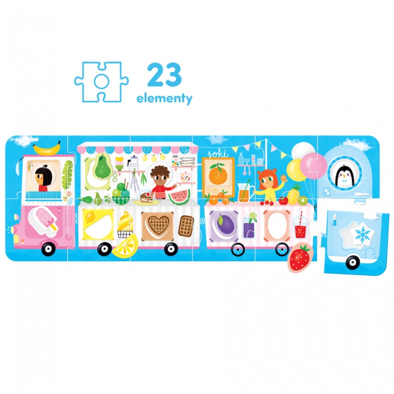 Mniam! Nadjechał kolorowy wóz ze smakołykami. Czas na puzzlową przygodę i zabawę w poznawanie barw, kształtów i smaków!