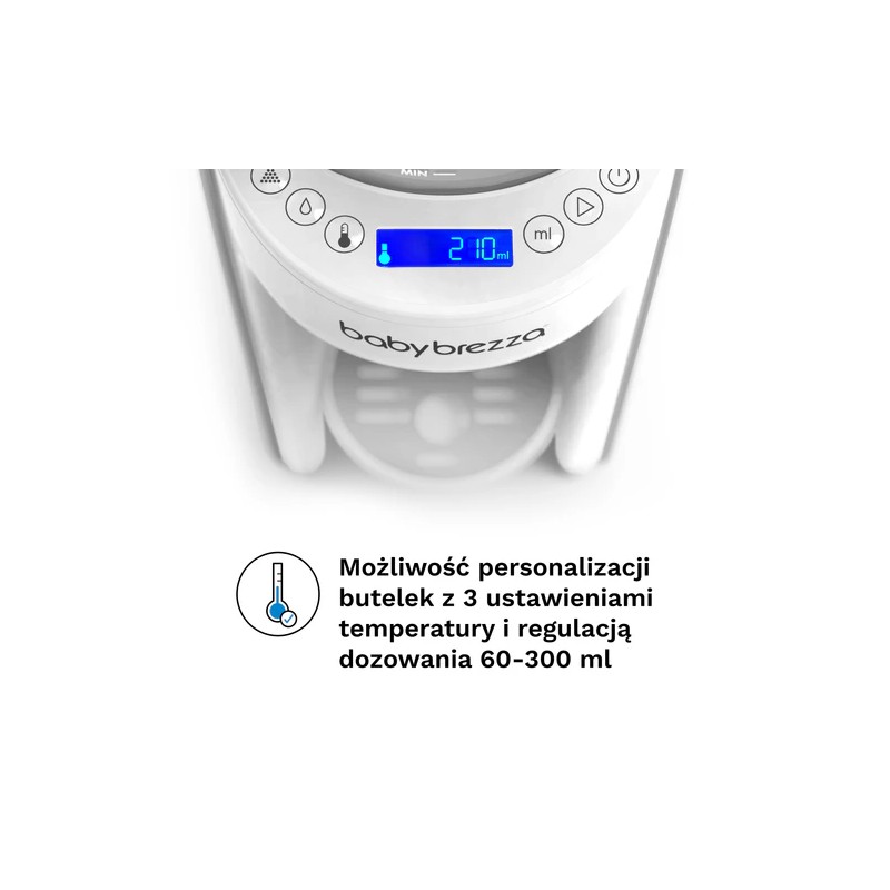Przygotowuje idealną butelkę! Dozuj w przyrostach co 30 ml w przedziale od 60 do 300 ml Wybierz jedno z 3 ustawień temperatury: temperatura pokojowa (22°C), temperatura ciała (37°C) i temperatura wyższa od temperatury ciała (40°C) Wybierz mleko modyfikowane lub samą wodę