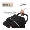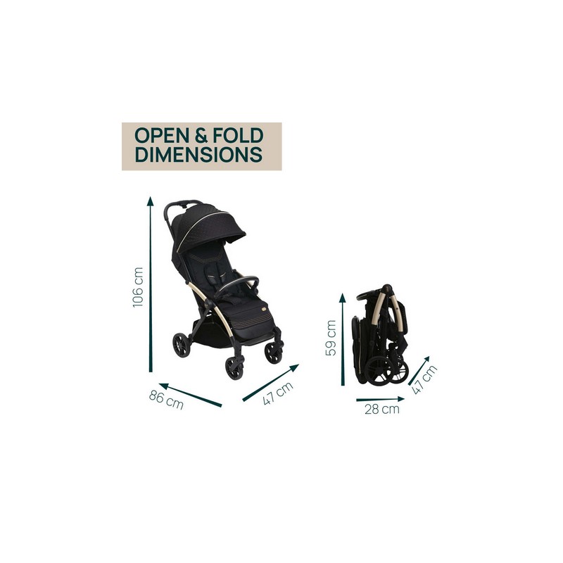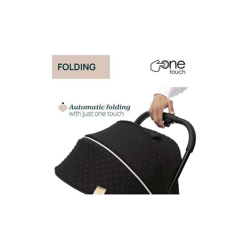 Wystarczy jedno dotknięcie, aby wózek sam się złożył. Po złożeniu jest naprawdę kompaktowy i stoi samodzielnie.