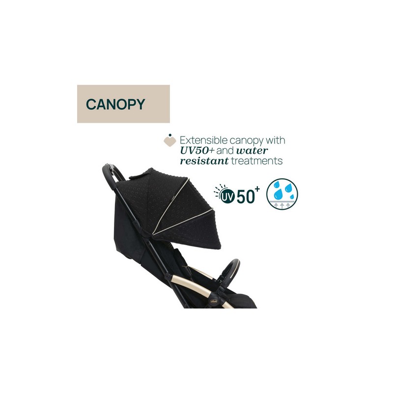 Daszek jest powiększany i gwarantuje najlepszą ochronę UV50+ i wodoodporność. Siateczkowe okienko w górnej części ułatwia wentylację i kontakt wzrokowy z dzieckiem.