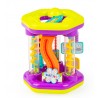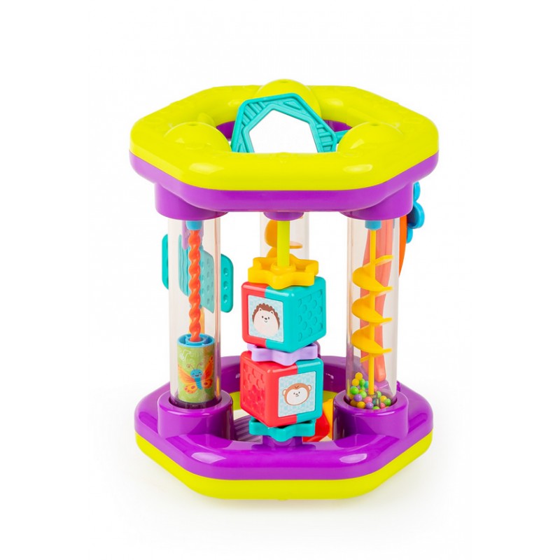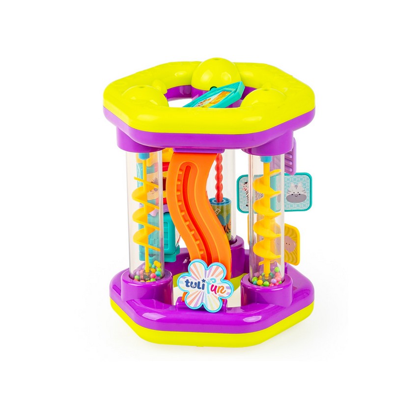 Znajdziemy tu kwiatek do przesuwania, obrazki zwierzątek do obracania, grzechotki, bezpieczne lusterko, a nawet zjeżdżalnie z koralikami. Wszystkie te ruchome i grzechoczące elementy mają za zadanie jak najlepiej stymulować zmysły maluszka, zachęcając go przy tym do aktywnej, sensorycznej zabawy!