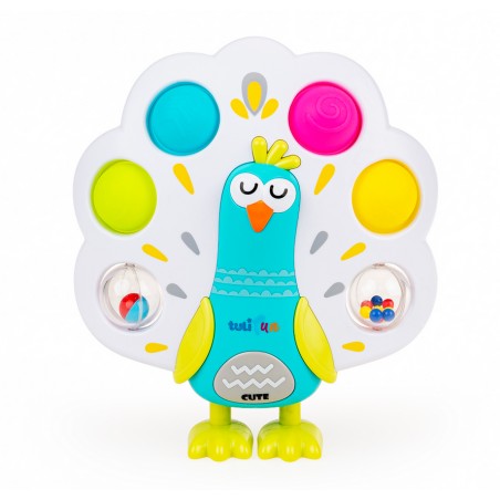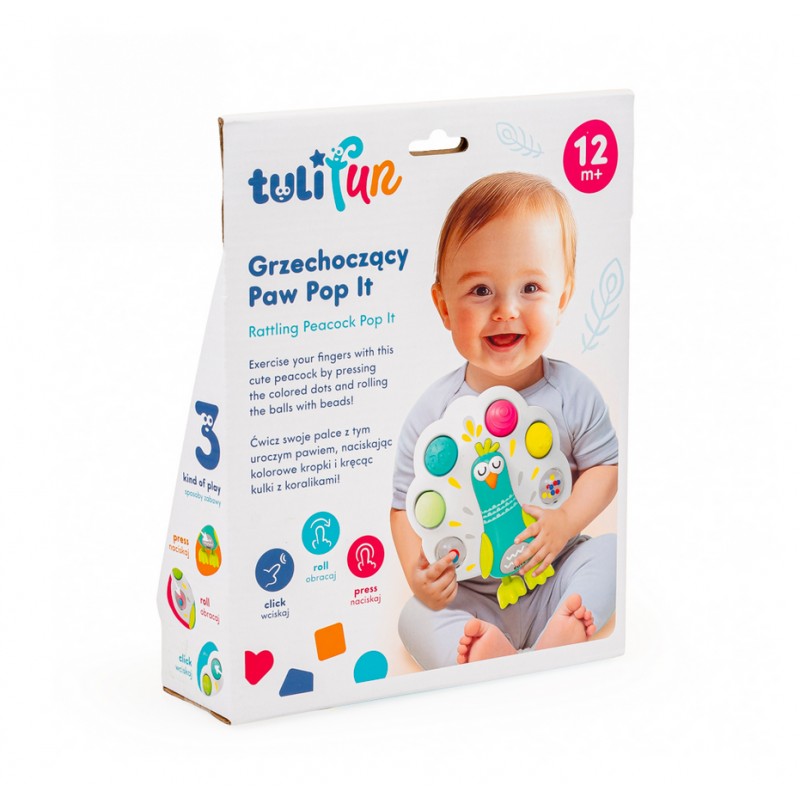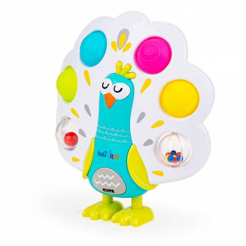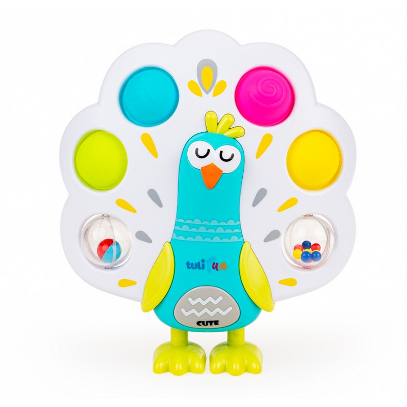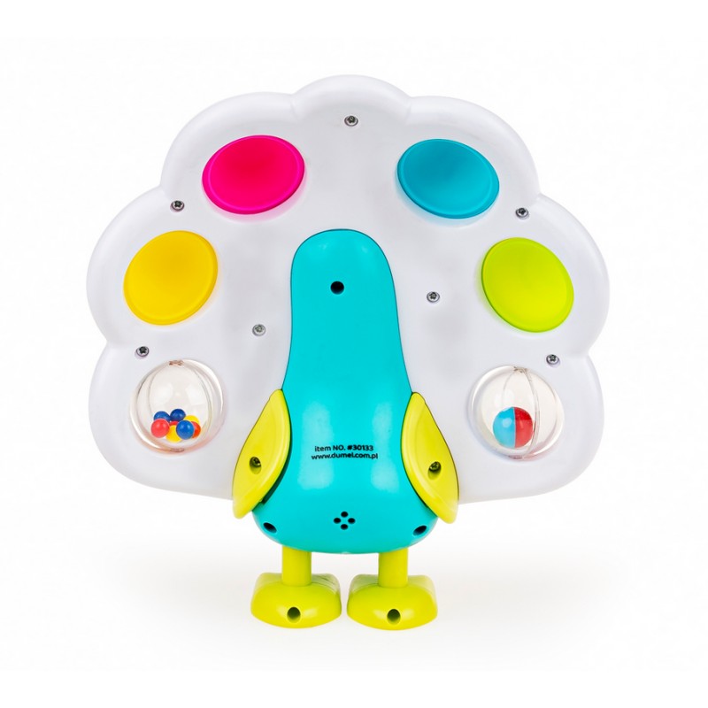Cztery kolorowe kuleczki do wciskania zdobią zróżnicowane wzory, a zadaniem bobasa jest przepchnąć je na drugą stronę zabawki, a następnie z powrotem, na przód pawia. Dwie przezroczyste, obrotowe kulki to grzechotki. Jedna kryje w sobie pojedynczą kuleczkę, a druga, kolorowe koraliki. Dźwięk wydaje także brzuszek pawia, który został ozdobiony piszczałką.