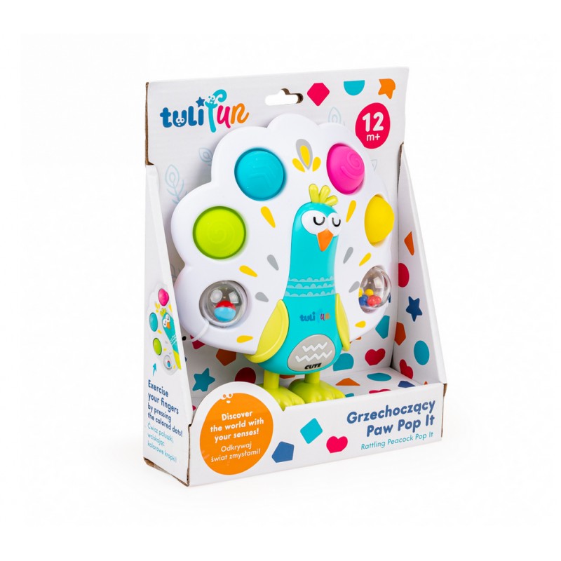 Wciśnij, obróć i zagrzechocz! W pawich piórkach ukryło się sześć kuleczek, a każda z nich zapewni małym paluszkom rozrywkę.