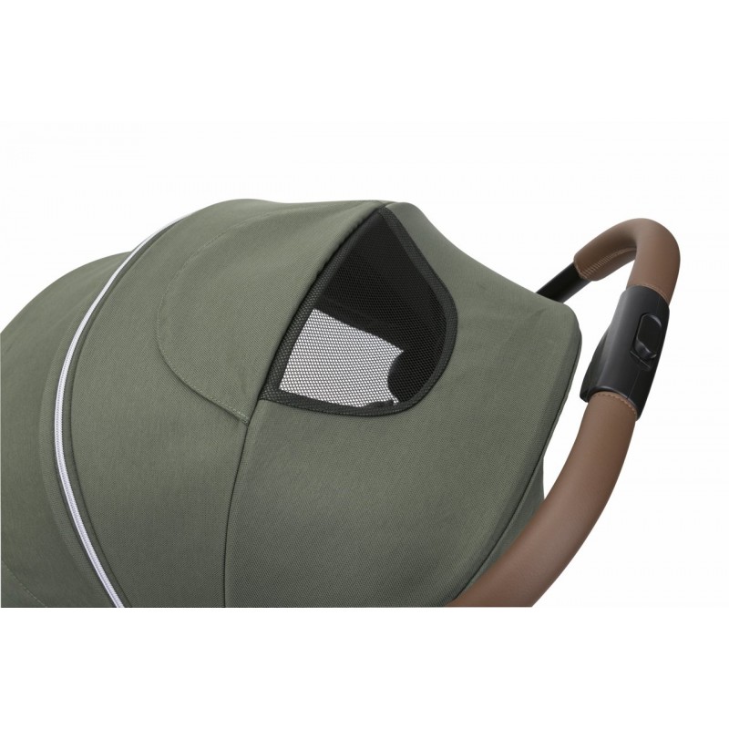 Szerokie i miękkie siedzisko z długim oparciem zapewnią najwyższy komfort. Budka jest rozkładana i powiększana oraz wyposażona w siateczkowe okienko do wentylacji i kontaktu wzrokowego z dzieckiem. Tkanina budki jest wodoodporna i ma ochronę UV50+.