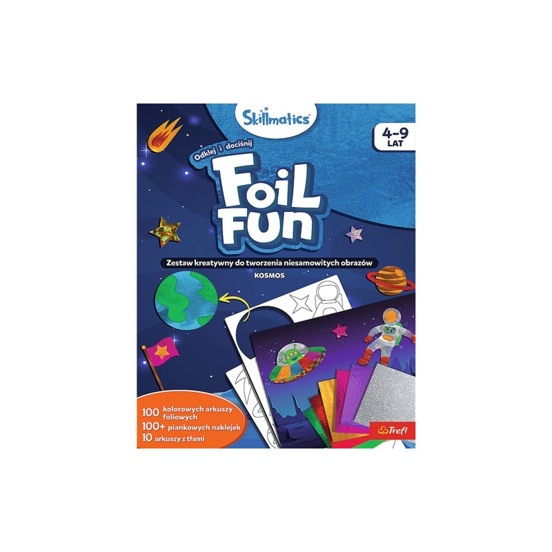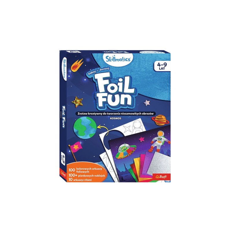 Foil Fun Kosmos to zestaw kreatywny do tworzenia magicznych dzieł sztuki. Kolorowe tła, folie i piankowe naklejki w przeróżnych kształtach, pozwolą dziecku wykreować własny świat pełen kosmonautów i statków kosmicznych.