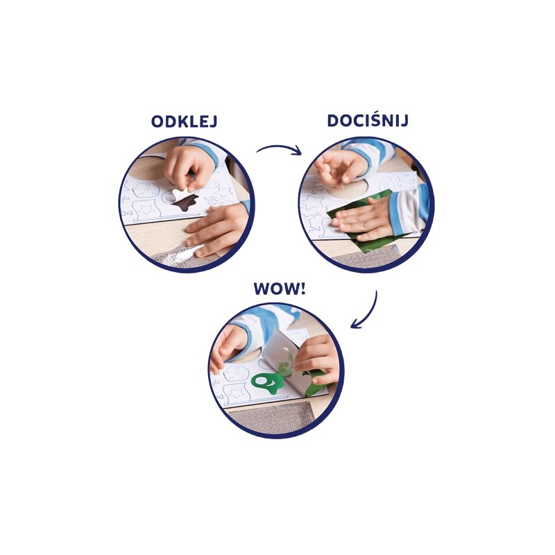 Zabawa jest niezwykle prosta i intuicyjna – wystarczy odkleić wierzchnią warstwę piankowej naklejki, a następnie przyłożyć wybrany arkusz foliowy i delikatnie go dociskać. Folia przyklei się do lepkiej powierzchni, tworząc efektowne, połyskujące wzory. Im więcej kolorowych dodatków, tym bardziej spektakularny efekt!