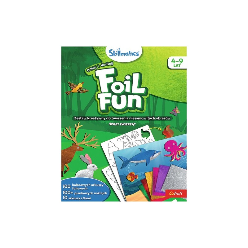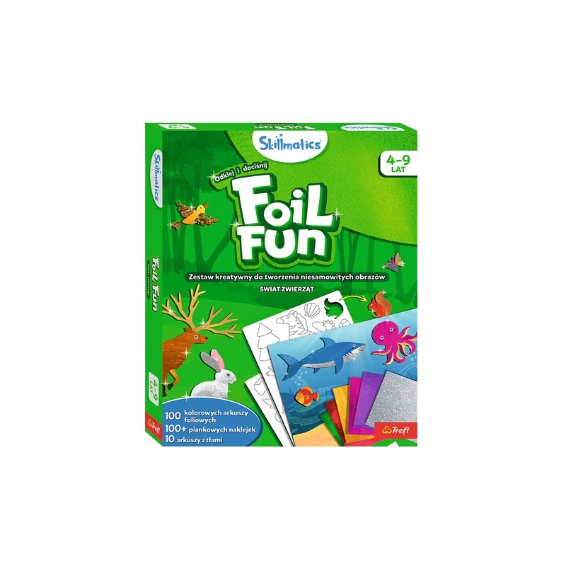 Foil Fun Świat Zwierząt to zestaw kreatywny do tworzenia magicznych dzieł sztuki. Kolorowe tła, folie i piankowe naklejki w przeróżnych kształtach, pozwolą dziecku wykreować własny świat pełen zwierząt.