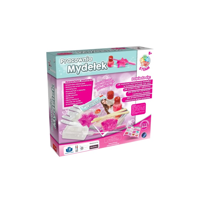 Wykonane własnoręcznie mydła są niepowtarzalne. Z dołączonej do zestawu książeczki edukacyjnej dowiedz się, jakie jest pochodzenie mydła i jak się je wytwarza.