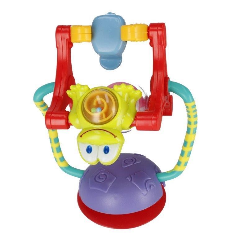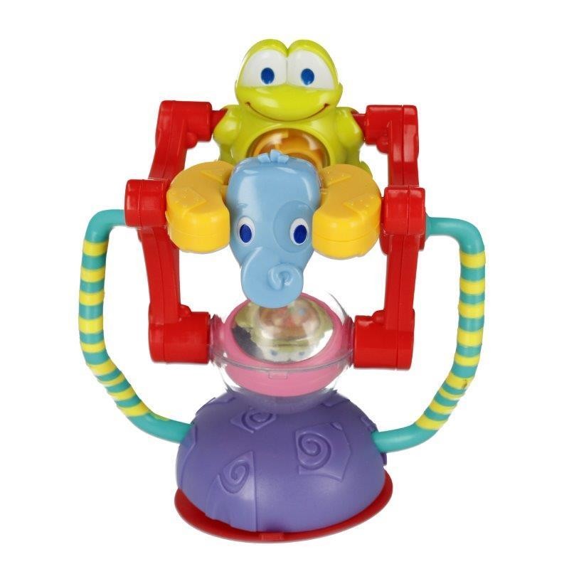 Karuzela o zróżnicowanej fakturze i wzorach, kolorach grzechotek, które kręcąc się, absorbują uwagę dziecka aktywizując jego zmysły wzroku, dotyku, słuchu. Przyssawka osadzona pod zabawką zapewnia stabilne mocowanie do blatu stolika, tacki wózka czy krzeska do karmienia.
