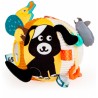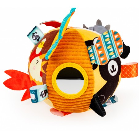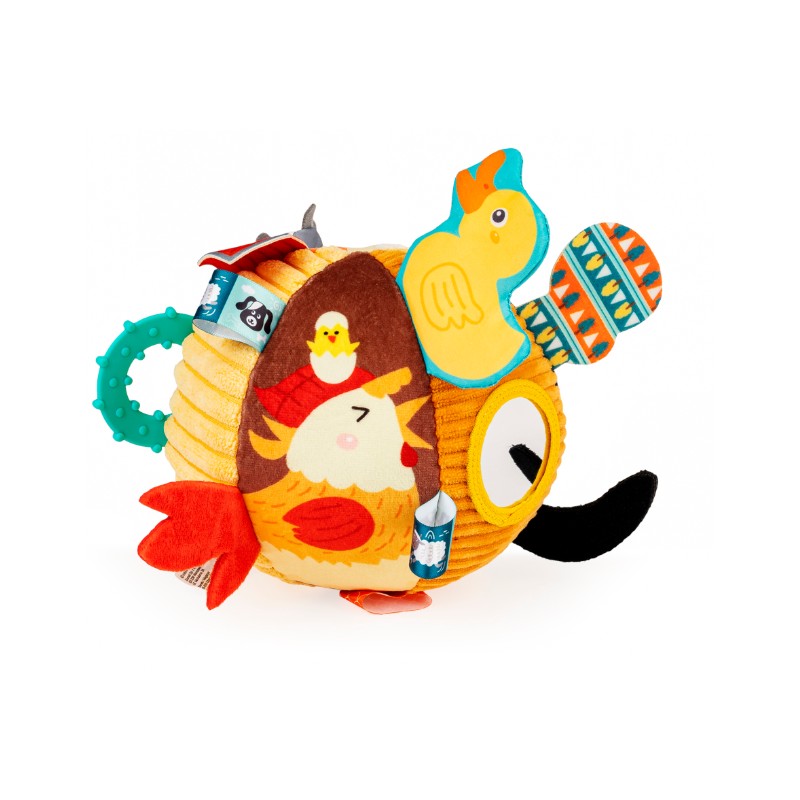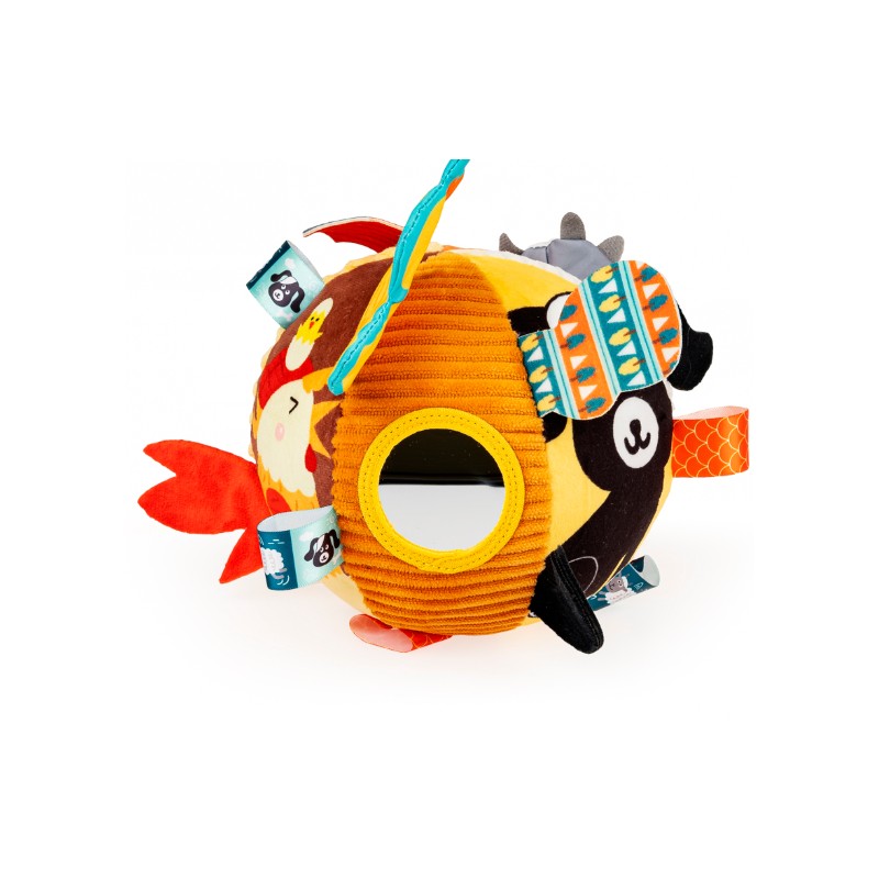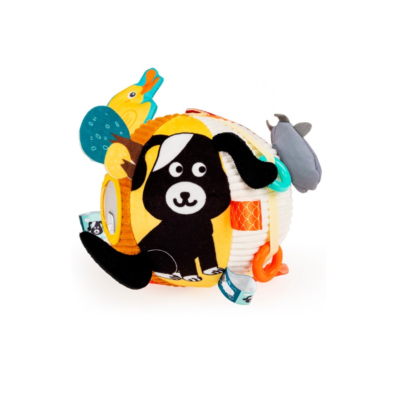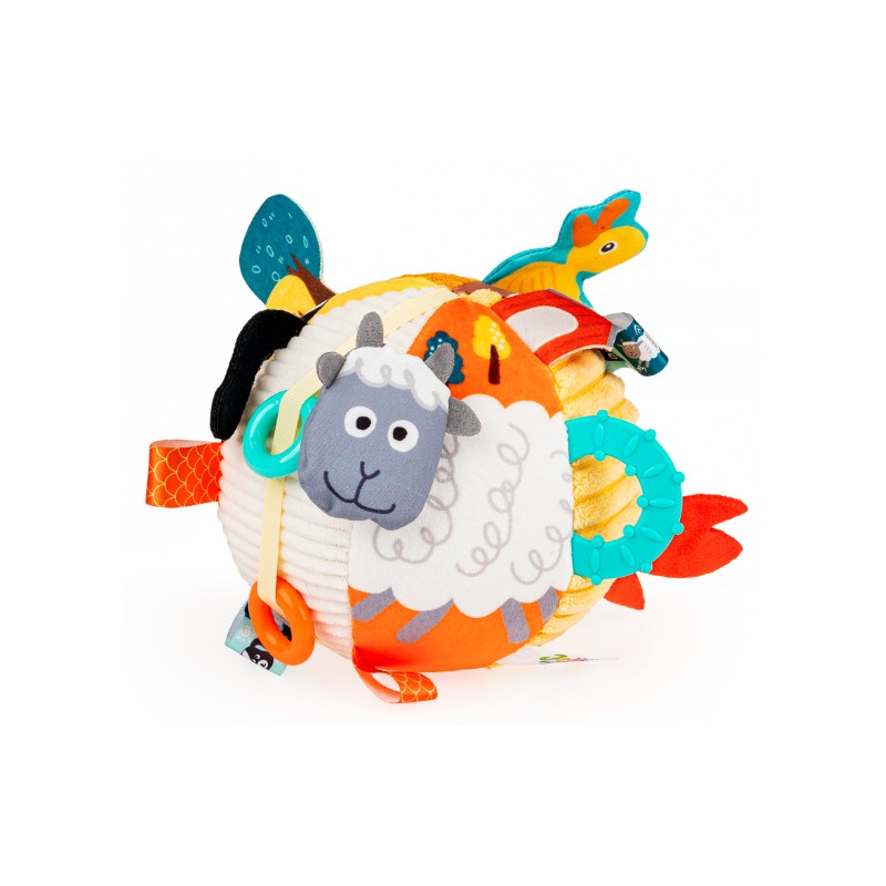 Zwierzakowa piłeczka pełna sensorycznych niespodzianek zabawi najmłodszych na wiele sposobów. Piłkę zdobią podobizny zwierzaków oraz bezpieczne lusterko do samopoznania bobasa. Dodatkowo, znajdziemy tu także wiele odstających elementów, stworzonych z myślą o aktywizowaniu dziecka i rozwijaniu jego zdolności poznawczych, a wśród nich piszczącą głowę owieczki, szeleszczącą kaczuszkę czy ruchome pierścienie do przesuwania. Wewnątrz piłeczki ukryty jest dzwoneczek, dzięki czemu przy potrząsaniu zabawka wydaje wesoły dźwięk.