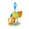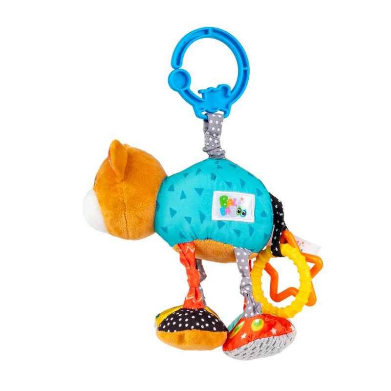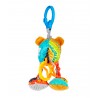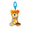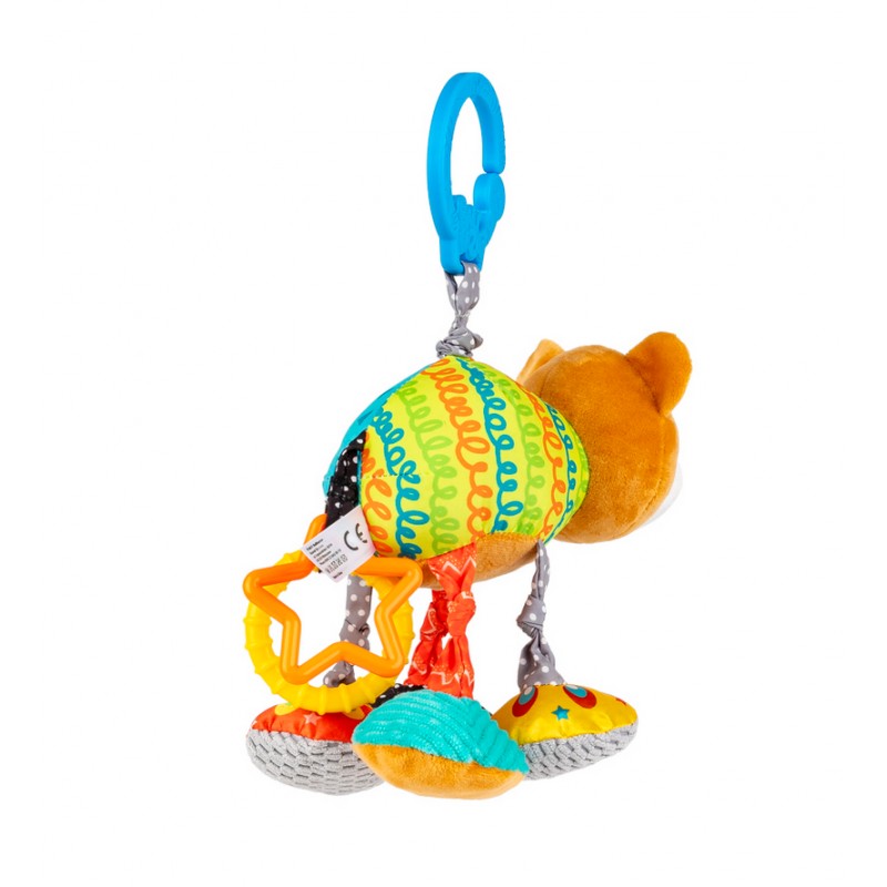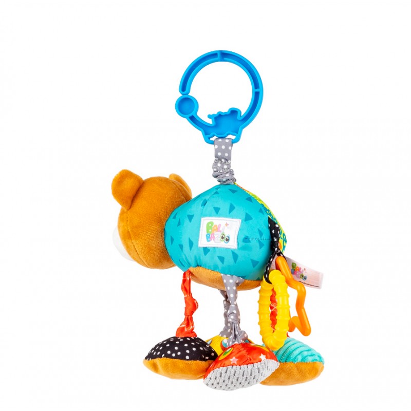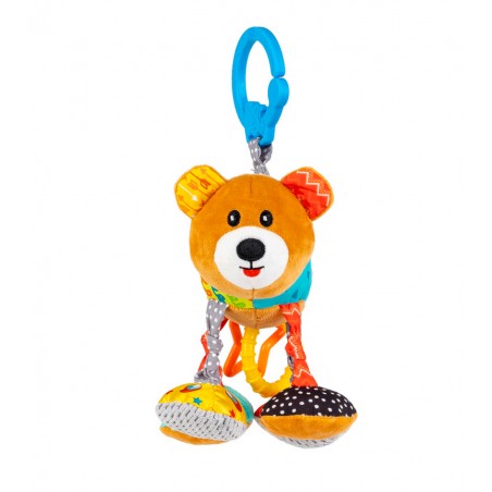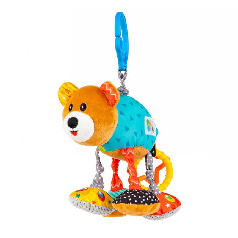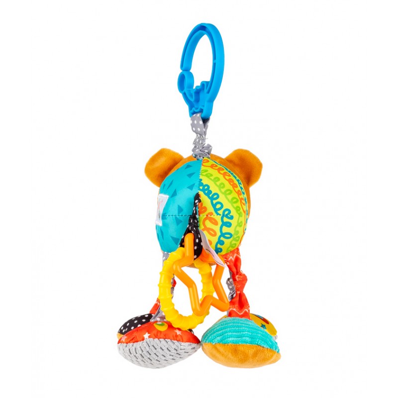 Miś, którego futerko tworzą materiały o zróżnicowanych kolorach, wzorach oraz fakturach, to pomysł na wesołe wprowadzenie do świata bodźców wzrokowych i dotykowych. Do zabawki doczepione są zawieszki w kształcie gwiazdki i kółeczka. Misiek posiada także funkcję wibracji, a uruchamia się ją poprzez pociągnięcie zabawki w dół. Praktyczna zawieszka pozwoli przymocować zwierzaka do poręczy łóżeczka czy uchwytu wózka, aby mógł towarzyszyć bobasowi w każdej sytuacji.