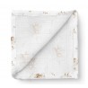 - Lekki i przewiewny kocyk – niezastąpiony podczas spacerów, drzemek i letnich dni. Bambusowa tkanina jest delikatna, ale jednocześnie wytrzymała, dzięki czemu pieluszka sprawdzi się jako okrycie wózka, gondoli czy fotelika samochodowego.