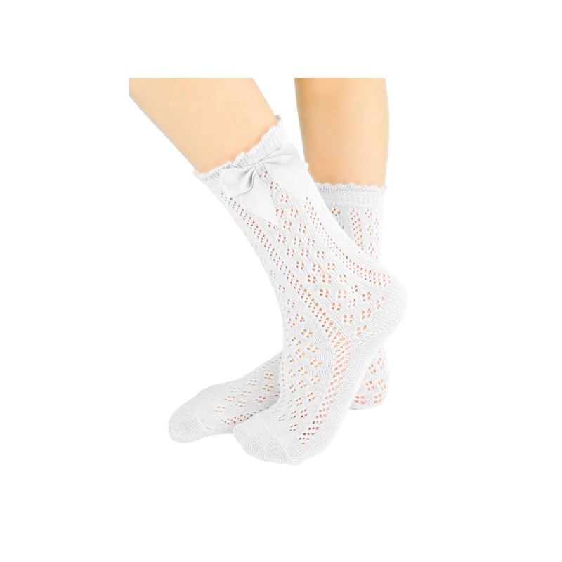 Idealny wybór na specjalne okazje i codzienne stylizacje. Wykonane z wysokiej jakości bawełny (75%), miękkie i przyjazne dla delikatnej skóry dziecka. Ażurowy wzór nadaje im elegancji, a kokardka na boku dodaje uroku.