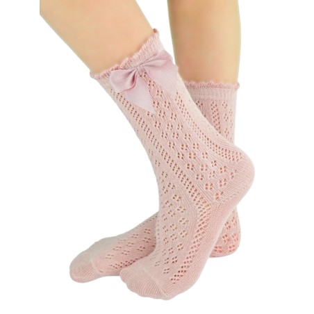 Idealny wybór na specjalne okazje i codzienne stylizacje. Wykonane z wysokiej jakości bawełny (75%), miękkie i przyjazne dla delikatnej skóry dziecka. Ażurowy wzór nadaje im elegancji, a kokardka na boku dodaje uroku.
