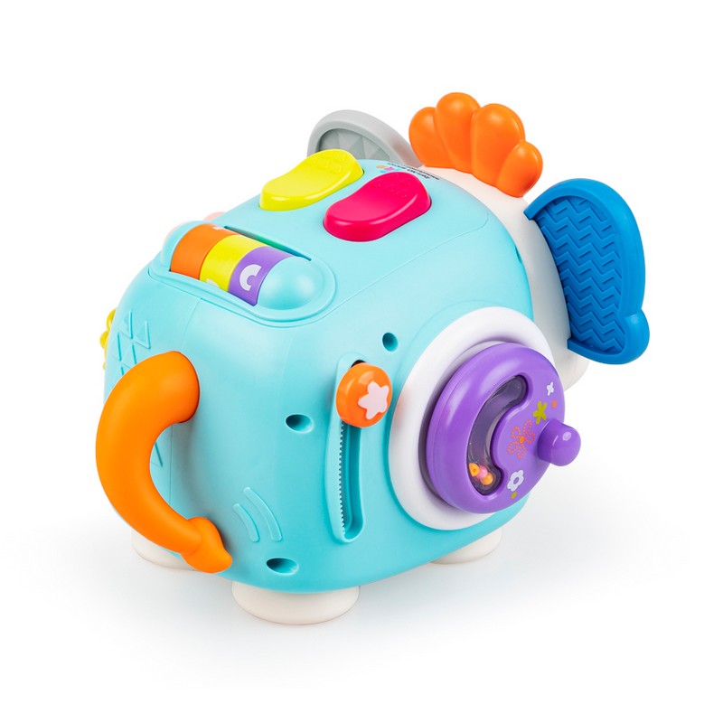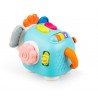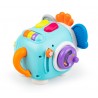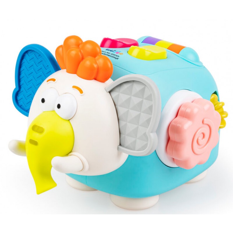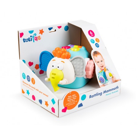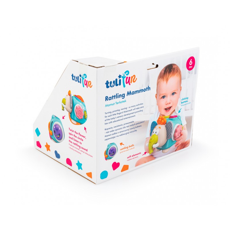 Mamut wyposażony został w szereg funkcji, które zajmą rączki malucha na długi czas. Na grzbiecie zwierzaka znajdują się dwa klikające przyciski, a na jego bokach terkoczący kwiatek i kółeczko, wypełnione grzechoczącymi koralikami, oraz obrotowe elementy. Poprzez zabawę i wykonywanie precyzyjnych czynności, bobas może ćwiczyć motorykę małą, odkrywając przy tym zależności przyczynowo – skutkowe. Uszka mamuta są miękkie i ozdobione wypustkami, dzięki czemu sprawdzą się świetnie w roli gryzaka.