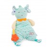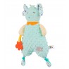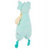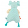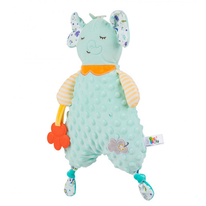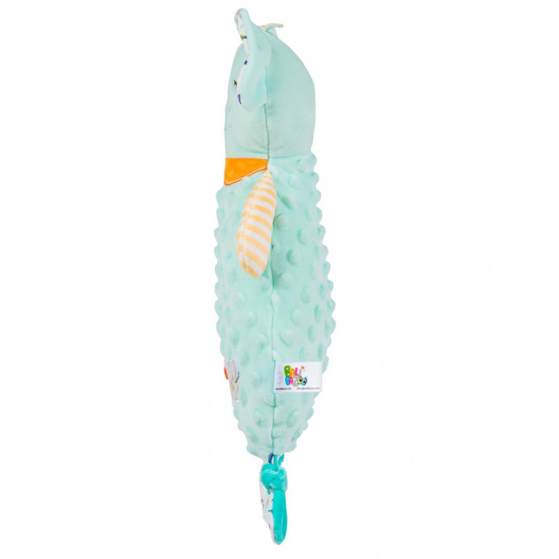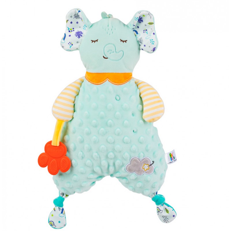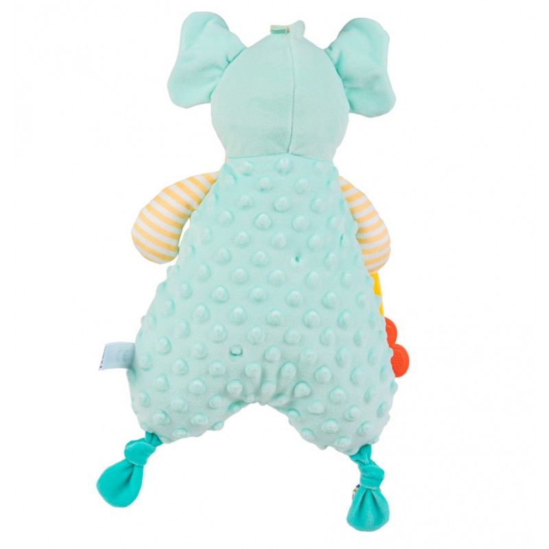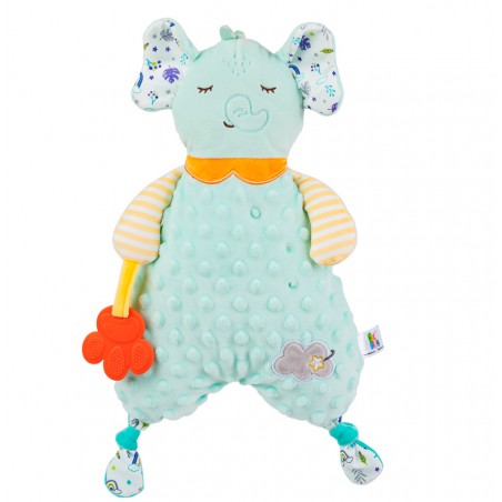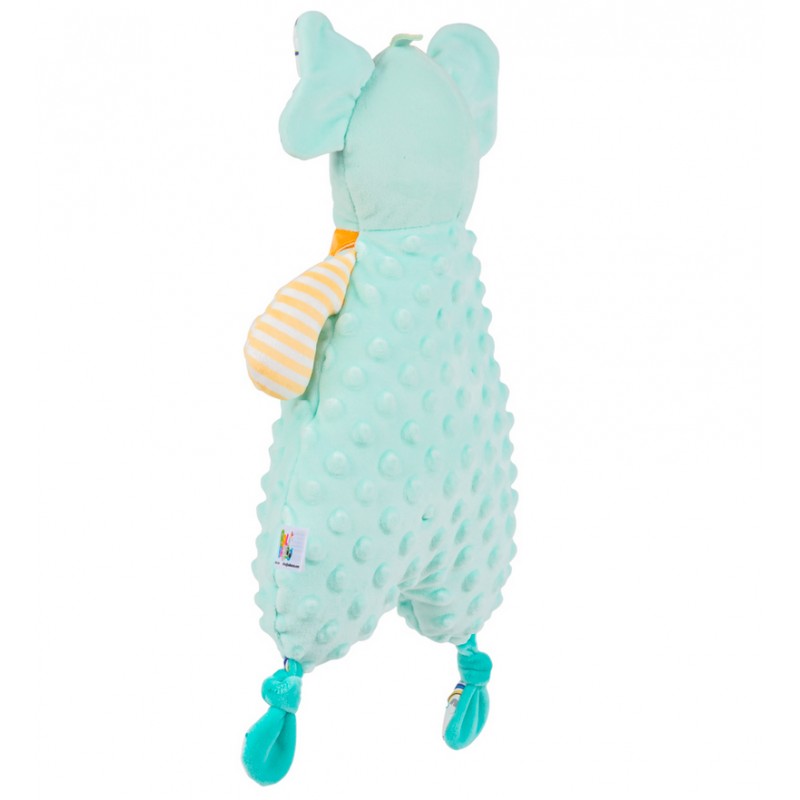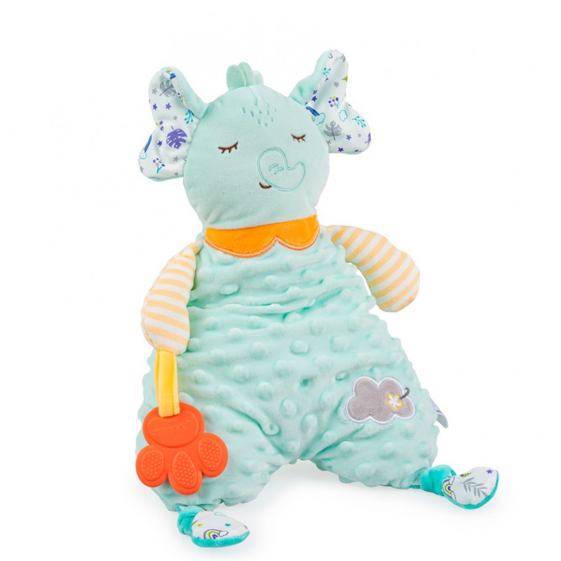 Zabawka uszyta została z materiałów różniących się kolorem, wzorem i fakturą, dzięki czemu stymulować będzie zmysły maluszka, pomagając mu tym samym w rozwijaniu zdolności poznawczych. Śpioszka zdobi haft w kształcie chmurki, para uroczych supełków oraz doczepiony do łapki gryzak z wypustkami, który z pewności przyda się dzidziusiowi podczas ząbkowania. Spłaszczona, mięciutka forma czyni ze słonika wymarzoną przytulankę.