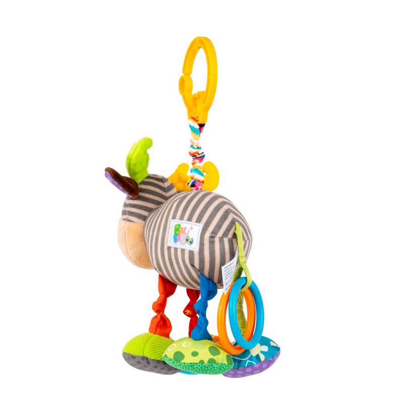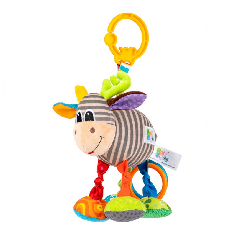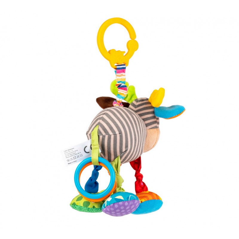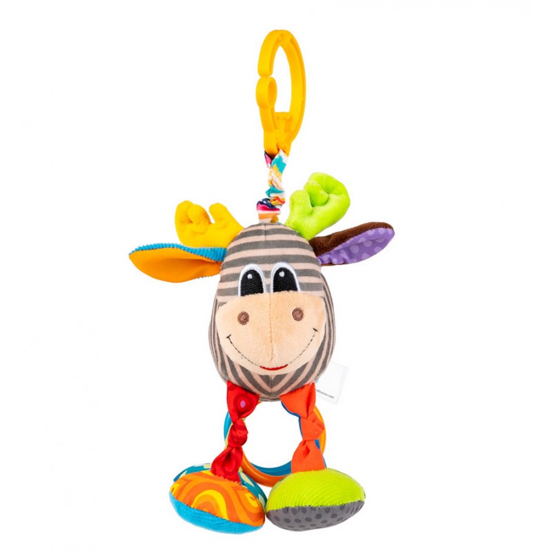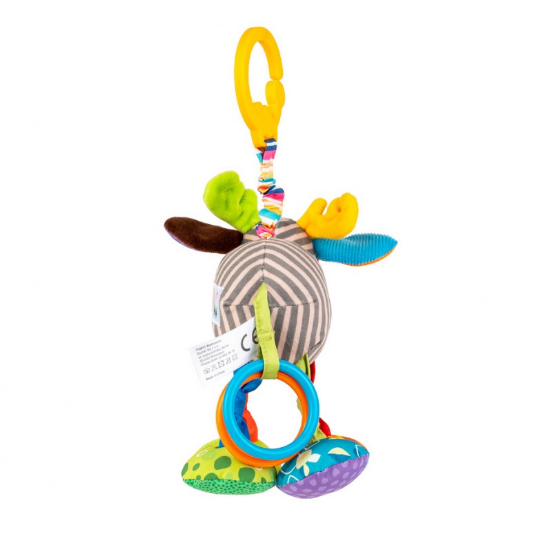 Zwierzak został uszyty z materiałów różniących się kolorem, wzorem i fakturą, a przy jego ogonku znajdują się dwa kolorowe kółeczka. Aby uruchomić wibrację, wystarczy pociągnąć łosia w dół, a ten podciągnie się na materiałowej harmonijce z powrotem w górę, zabawnie przy tym wibrując. Zwierzak wyposażony jest w praktyczną zawieszkę, dzięki czemu bez trudu przymocujesz go wybranym miejscu.