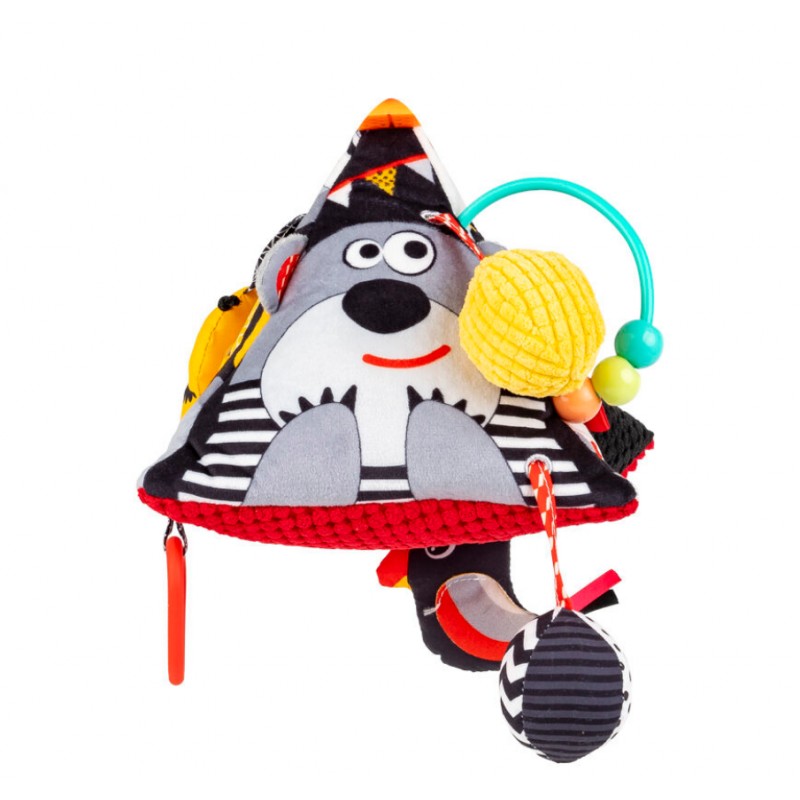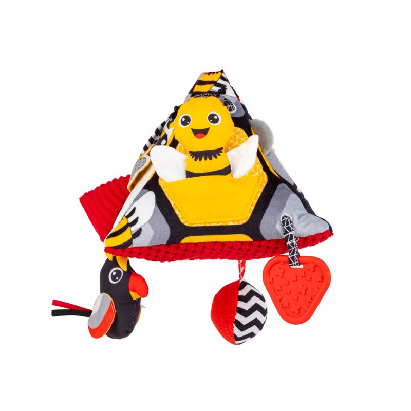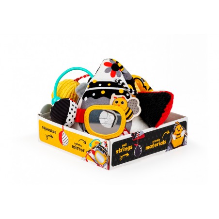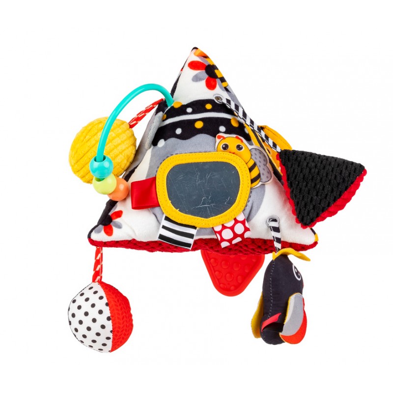 Na każdej z mięciutkich ścianek piramidki kryją się inne skarby, a wśród nich: piszczałka, bezpieczne lusterko do samopoznania dzidziusia, otoczone materiałowymi metkami, a nawet tasiemki do przeciągania, ozdobione mniejszymi zabaweczkami, w tym pszczółką, którą można włożyć do specjalnej kieszonki. Znajdziemy tu także gryzak z wypustkami, który z pewnością przyda się podczas ząbkowania, przynosząc ulgę obolałym dziąsłom malucha. Praktyczny uchwyt w formie pałąka z koralikami do przesuwania paluszkiem, ułatwi podnoszenie zabawki. Zróżnicowane materiały, z których uszyta została piramidka, stymulować będą zmysły bobasa, inspirując go do sensorycznego poznawania świata.