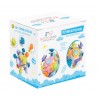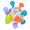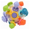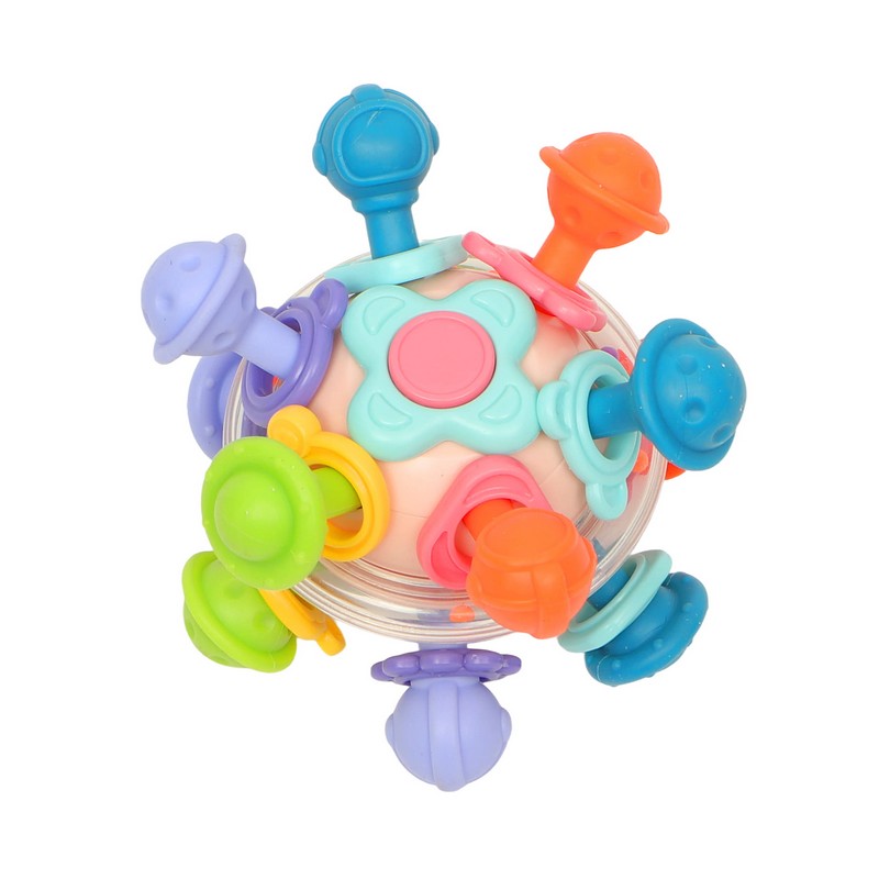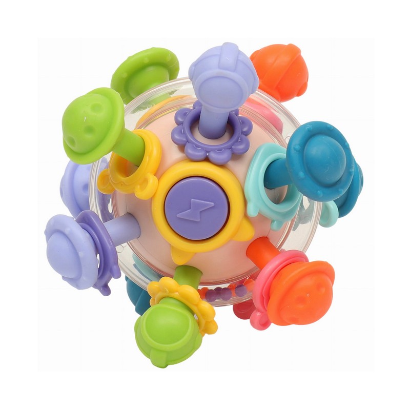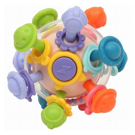 Na każdej wypustce umieszczono kolorową plastikową obręcz, która przy poruszaniu wydaje delikatne dźwięki. Dodatkowo, centralna część kuli zawiera przezroczystą grzechotkę z drobnymi kuleczkami, która aktywizuje zmysł słuchu i przyciąga wzrok dziecka.