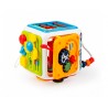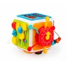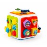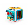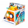 Znajdziemy tu elementy do przesuwania, śmigło do obracania, sznureczki, przez które widać wnętrze zabawki, przyciski aktywujące dźwięk i podświetlenie bębenków, praktyczny, podnoszony uchwyt do przenoszenia kostki, a także najlepsze – odpinaną, dwustronną ściankę z trybikami do kręcenia i fakturowanymi linkami z wypustkami do przeciągania! Możliwość odpięcia ścianki, pozwala zabrać ją ze sobą w dowolne miejsce, aby wszędzie mogła towarzyszyć maluchowi.