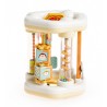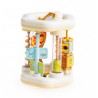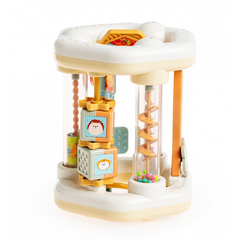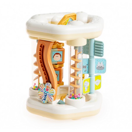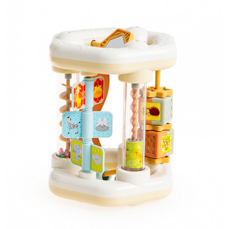 Na małe rączki czekają obrazki zwierzątek do obracania i kwiatek do przesuwania, a także koraliki, które po przekręceniu rolera do góry nogami, przesypią się, wydając przy tym wesoły, grzechoczący dźwięk. Znajduje się tu też obrotowe lustereczko do samopoznania malucha. Klocki umieszczone na ściance zabawki posiadają fakturowaną powierzchnię, przez co, podczas zabawy, stymulować będą zmysł dotyku malucha.