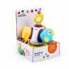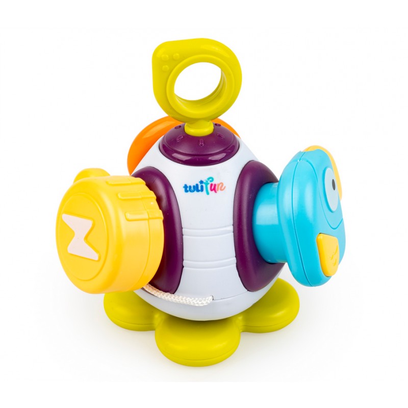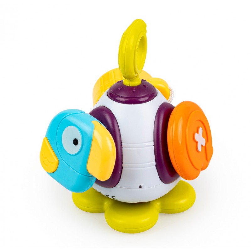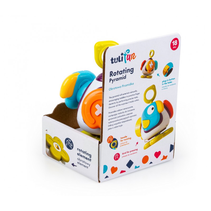 Na każdej ze ścianek piramidki kryje się inne zadanie do wykonania: obrotowy element, piszczący ptaszek do naciskania, wtyczka do dopasowania w otwory i wciskania, a także terkoczący element do przekręcania. Po ustawieniu piramidki na kwiatku, zdobiącym jedną ze ścianek, można nią kręcić za pomocą paluszka.