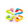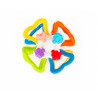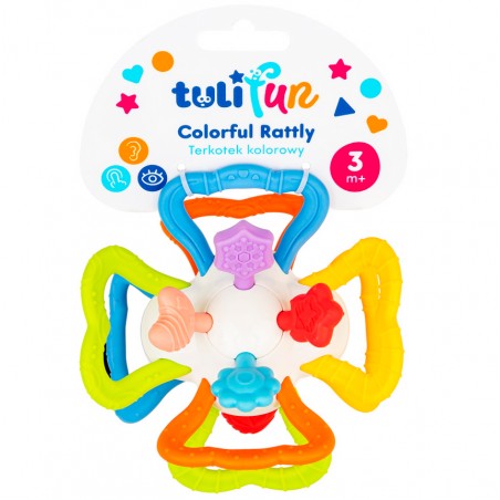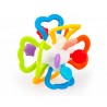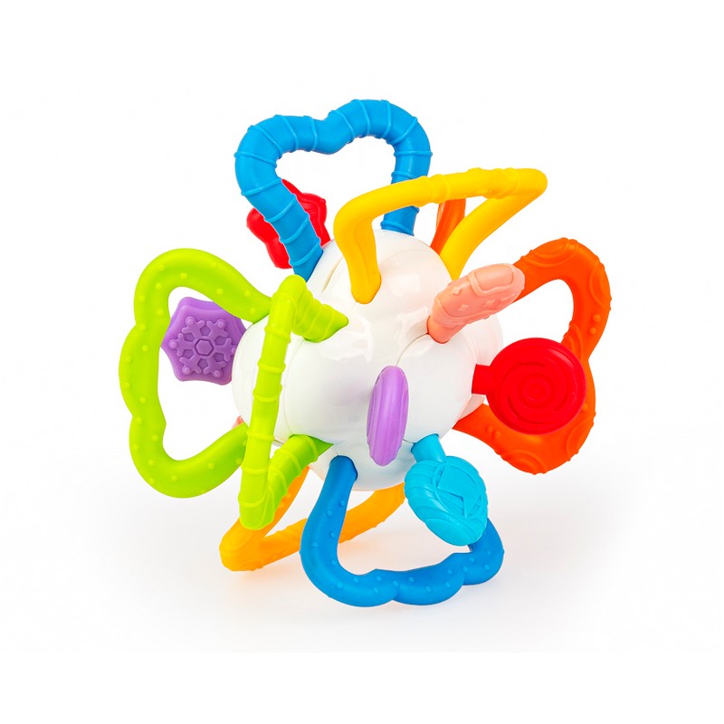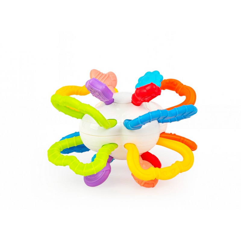 Poza miękkimi, nafaszerowanymi wypustkami uchwytami, pełniącymi zarazem funkcję gryzaków, znajdują się tu miękkie kształty, także z wypustkami, które podczas gryzienia, przyniosą ulgę obolałym dziąsłom ząbkującego maluszka. Przy przekręcaniu połówek zabawki w odwrotnych kierunkach względem siebie, wydaje ona zabawny, miły dla ucha odgłos.