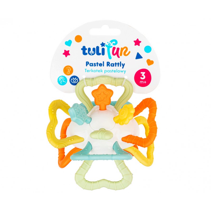 Poza główną funkcją terkotania, którą wyzwala przekręcanie połówek zabawki w odwrotnych kierunkach względem siebie, zabawka wyposażona jest w osiem gryzako – uchwytów z wypustkami oraz kolorowe kształty, także o fakturowanej powierzchni. Forma terkotka została dostosowana do małych rączek, przez co korzystanie z zabawki będzie dla malucha czystą przyjemnością.