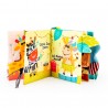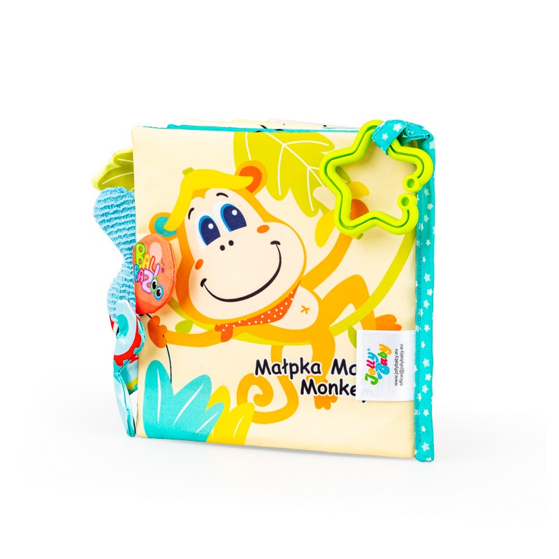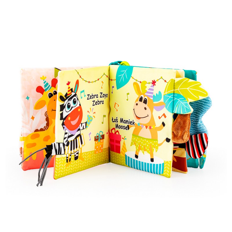 Ta materiałowa książeczka wyposażona została w szeleszczącą okładkę i praktyczną zawieszkę do przyczepienia książeczki w dowolnym miejscu. A co znajdziemy w środku? Kryją się tu wesołe, kolorowe obrazki, nazwy zwierzaków w języku polskim i angielskim oraz wystające z poszczególnych stron elementy, różniące się między sobą fakturą materiałów.