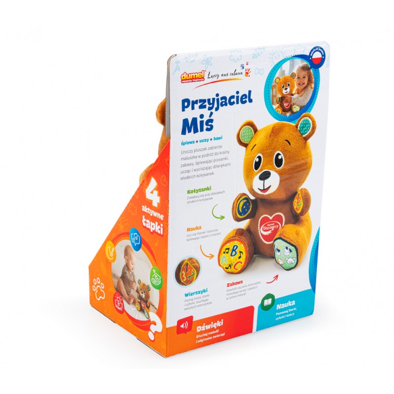 Każda z misiowych łapek aktywuje inne dźwięki, a drugie naciśnięcie tej samej łapki pozwala wyłączyć dźwięk, bez konieczności wysłuchania go do końca. Miś zna kołysanki, potrafi recytować wierszyki, śpiewa piosenki o literkach oraz kolorach, a także odtwarza odgłosy zwierząt wraz z melodią. Zabawka nie tylko więc bawi, ale też uczy, aktywizując malucha lub go wyciszając, w zależności od tego, którą łapkę wybierze.