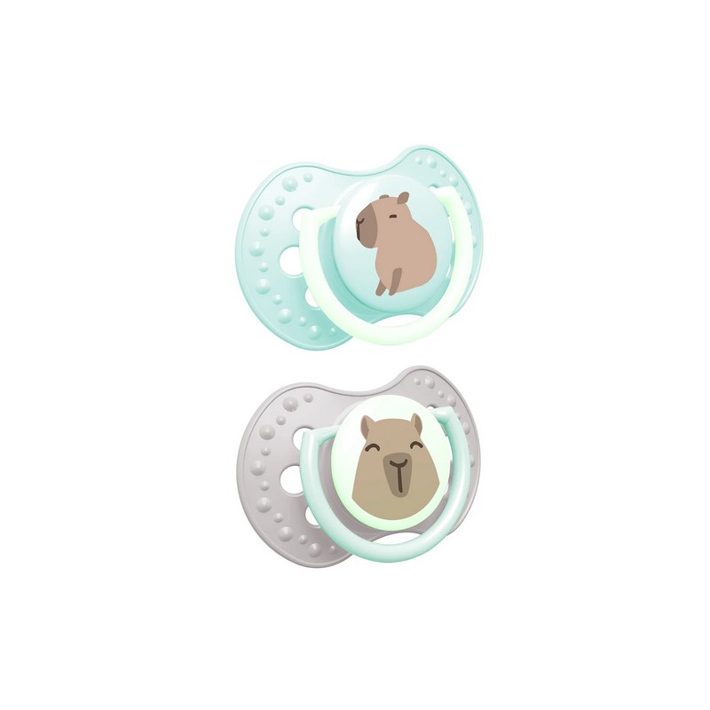 Jeden ze smoczków w zestawie posiada uchwyt, a drugi kapsel świecący w ciemności, co ułatwia znalezienie smoczka w nocy.