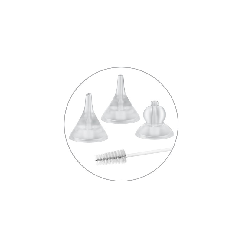 Ultramiękkie 3 silikonowe nasadki, które można dostosować do rodzaju wydzieliny i wieku niemowlaka. W zestawie dodatkowa szczoteczka czyszcząca. Gwarancja higieny i dopasowania do potrzeb najmłodszych.