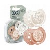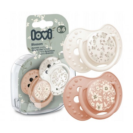 Wybierz wyróżniający się delikatnym kwiatowym wzorem i pastelową kolorystyką smoczek silikonowy dynamiczny LOVI 0-6 m 2 szt. Blossom Ivory.