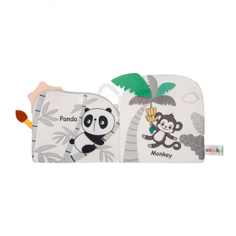 – elementy sensoryczne – każda strona książeczki zawiera różnorodne tekstury (np. miękkie liście, pluszowe elementy) oraz przyjemne w dotyku akcenty, które rozweselą maluszka i zachęcą go do interakcji,