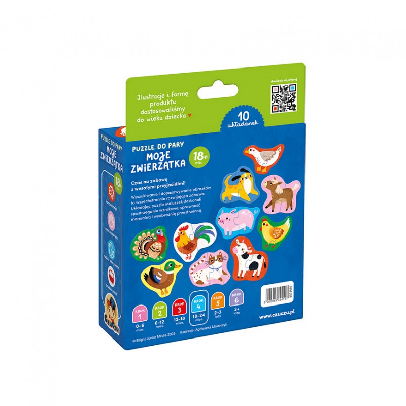 Wesołe zwierzątka z gospodarstwa zapraszają do mnóstwa kreatywnych zabaw. Wyszukiwanie i łączenie dwuelementowych puzzli to doskonały sposób na rozwijanie spostrzegawczości i małej motoryki. Naśladowanie odgłosów i nazywanie zwierzątek rozwija aparat mowy i poszerza słownictwo, a naśladowanie ich to świetna gimnastyka.