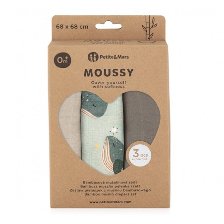 PETITE&MARS Zestaw pieluszek z muślinu bambusowego 3szt Moussy Whale Song
