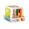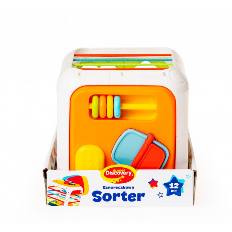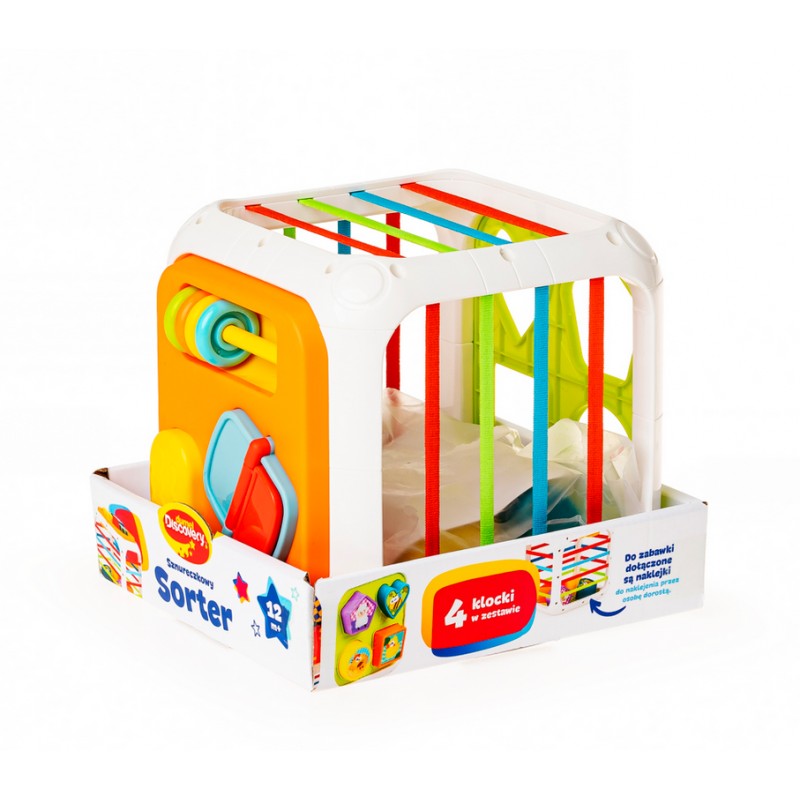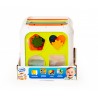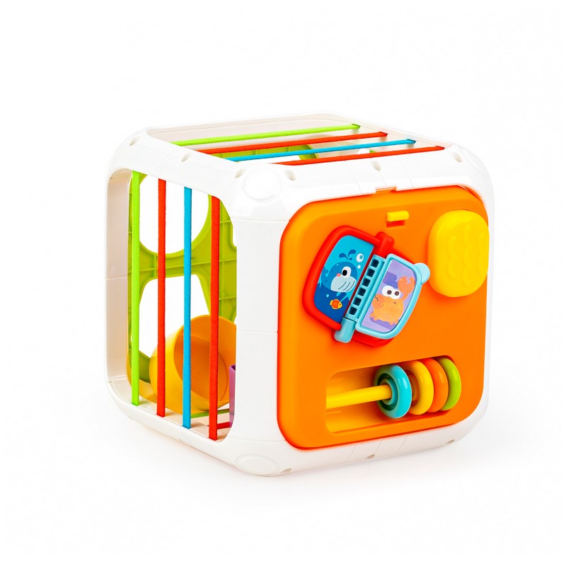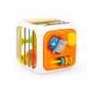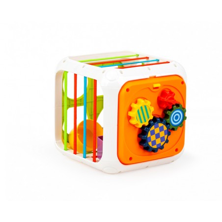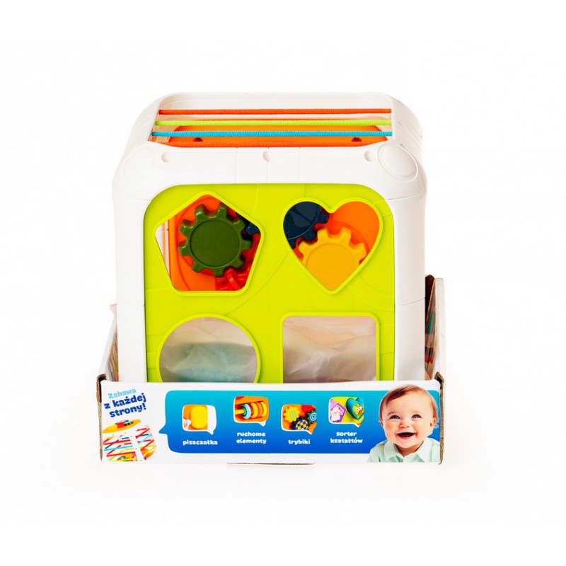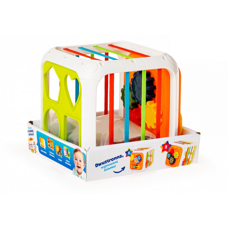 Zdobią ją sznureczki i sorter kształtów, a jedna z jej ścianek jest odpinana, co zapewnia wygodny dostęp do klocków. Poza tym, że ścianka ta jest odpinana, jest ona również dwustronna. Z jednej strony znajdują się trybiki do kręcenia, a z drugiej, ruchome elementy do przesuwania. Możliwość odpięcia ścianki pozwala zabrać ją ze sobą na wycieczkę, bez konieczności przewożenia całej kostki.